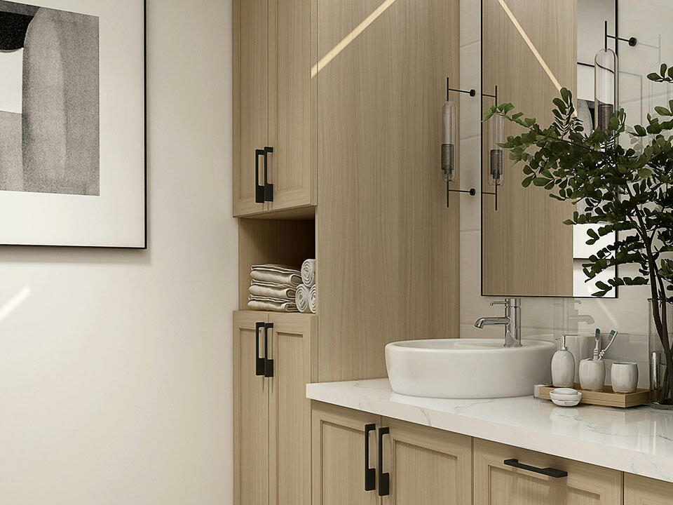 Similar to the living room, opt for light colors and light-reflective surfaces in a small bathroom. A large mirror will also make the room appear larger. In a small bathroom, every square centimeter of the floor is valuable. Therefore, remember to include a cabinet under the sink to store household chemicals. Also, consider installing a tall custom-made closed rack. It will accommodate all the cosmetics, laundry basket, and towels. Organize a place for every item in the design stage to avoid leaving things on the surface after use. This will help you keep the clutter in check.