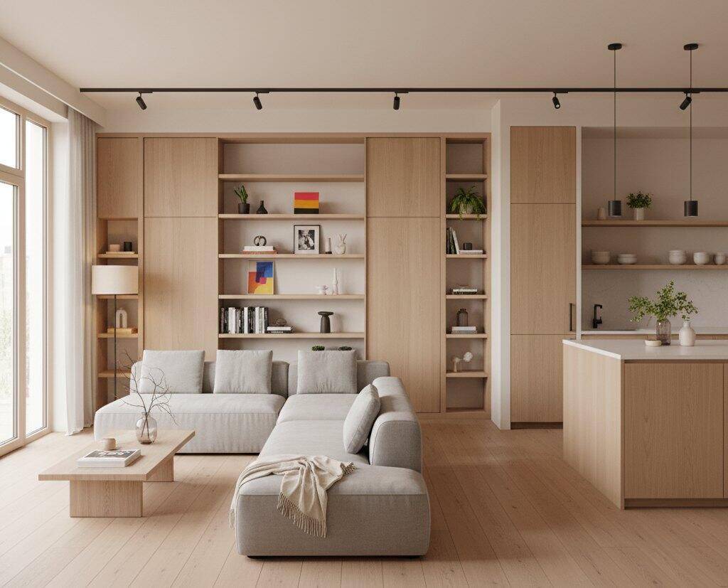 Storage spaces must be large enough to maintain order, but not all need to be hidden. Open shelves can display beautiful objects, books, or plants, becoming decorative elements. The 80/20 rule – hide 80% of items and display 20% as decoration.