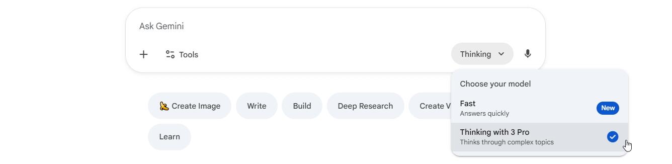 El acceso a la versión estándar de Nano Banana se puede obtener mediante el chat gratuito de Gemini. Para usarlo, sólo necesitas tener una cuenta de Gmail; es el único requisito. Inicio sesión con la misma cuenta que uso para el correo electrónico y otros servicios de Google. Después de iniciar sesión tengo acceso a dos modelos: “rápido” y “pensante”. La elección entre ellos determina qué versión de Nano Banana usaré. Si elijo la opción “rápido”, se utilizará la versión estándar de Nano Banana. En cambio, al seleccionar “pensante”, activo el modelo Nano Banana Pro, que ofrece mejor calidad en las imágenes generadas y mayores capacidades de interpretación de los prompts.
