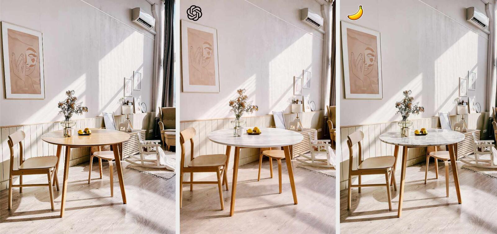 En ambos casos los objetos están colocados correctamente según las instrucciones. Sin embargo, el resultado de Nano Banana Pro se ve sin duda más natural, realista y detallado. La imagen de GPT desafortunadamente parece más una típica imagen generada por IA: demasiado suave, con texturas plásticas y una iluminación artificial.
