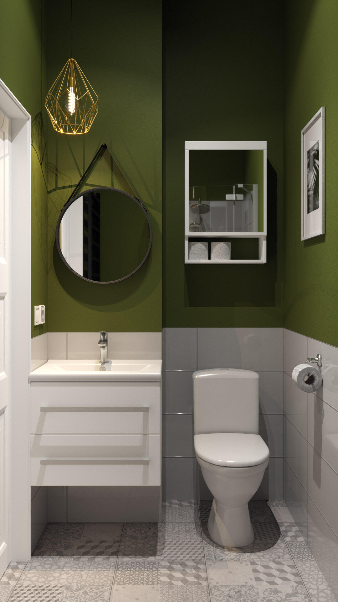 Observa que en el espejo sobre el lavabo y en el armario sobre el inodoro todavía se refleja el cielo. Para que los materiales reflectantes se comporten como si la sección ni siquiera existiera, debes marcar Solo rayos de cámara.