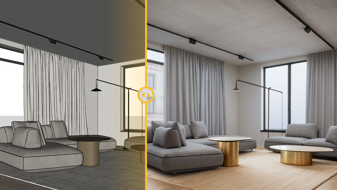 También es posible generar diferentes efectos luminosos, desde la luz natural del día hasta una cálida atmósfera nocturna. Aunque esta tecnología aún no es tan precisa como las herramientas dedicadas LightMix en V-Ray y Corona, abre nuevas posibilidades para los creadores. Es una solución ideal para conceptos rápidos y experimentos de ambiente interior, que ahorran tiempo mientras mantienen una alta calidad visual.