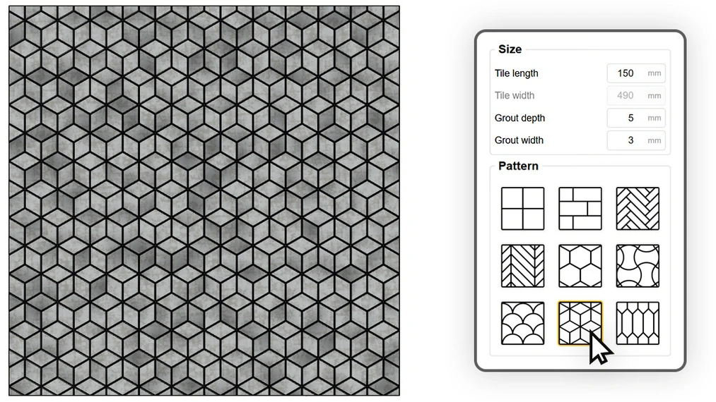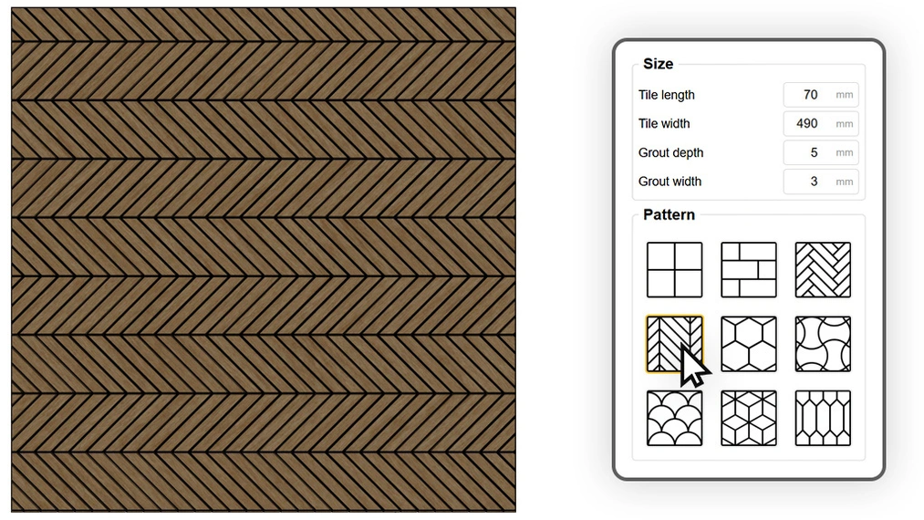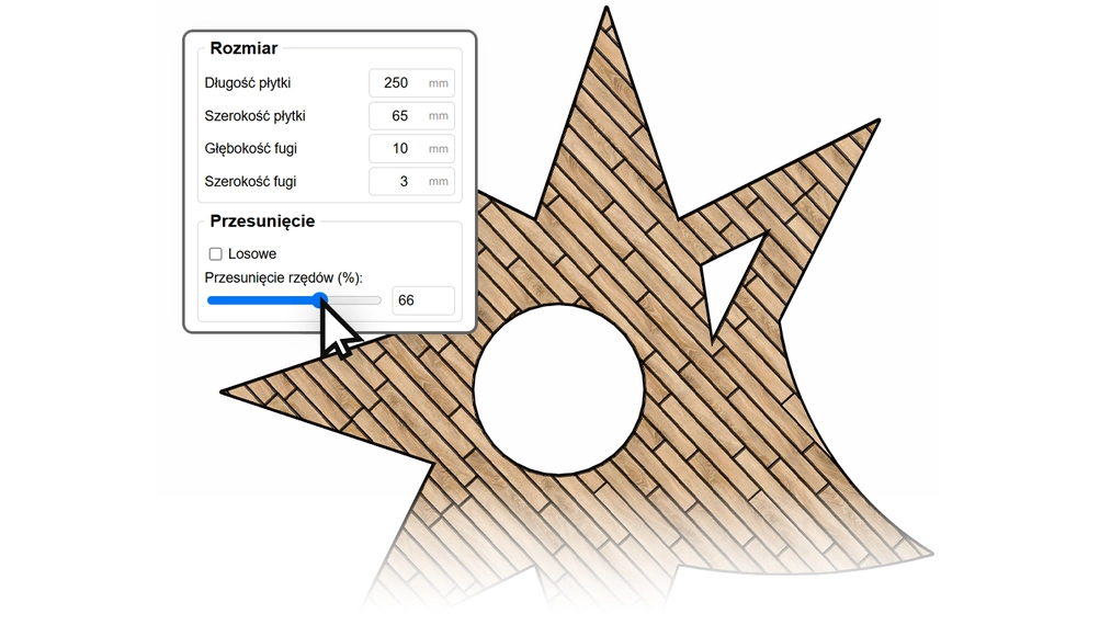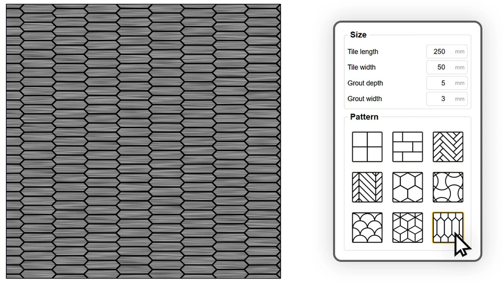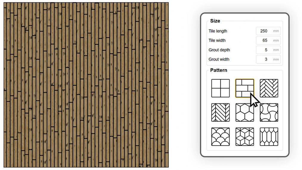 Un verdadero camaleón entre los patrones. Gracias al control total de las dimensiones y el desplazamiento de las filas, un solo algoritmo permite lograr materiales muy diferentes. Ajustando un formato pequeño y un gran biselado, crearás la icónica pared de azulejos tipo "subway". Al alargar el elemento y cambiar el desplazamiento, obtendrás un suelo de madera clásico o un patrón de ladrillo corrido. Además, al activar la opción de desplazamiento aleatorio, convertirás un suelo perfecto en un parqué rústico o adoquines antiguos donde cada junta cae en un lugar diferente e impredecible.