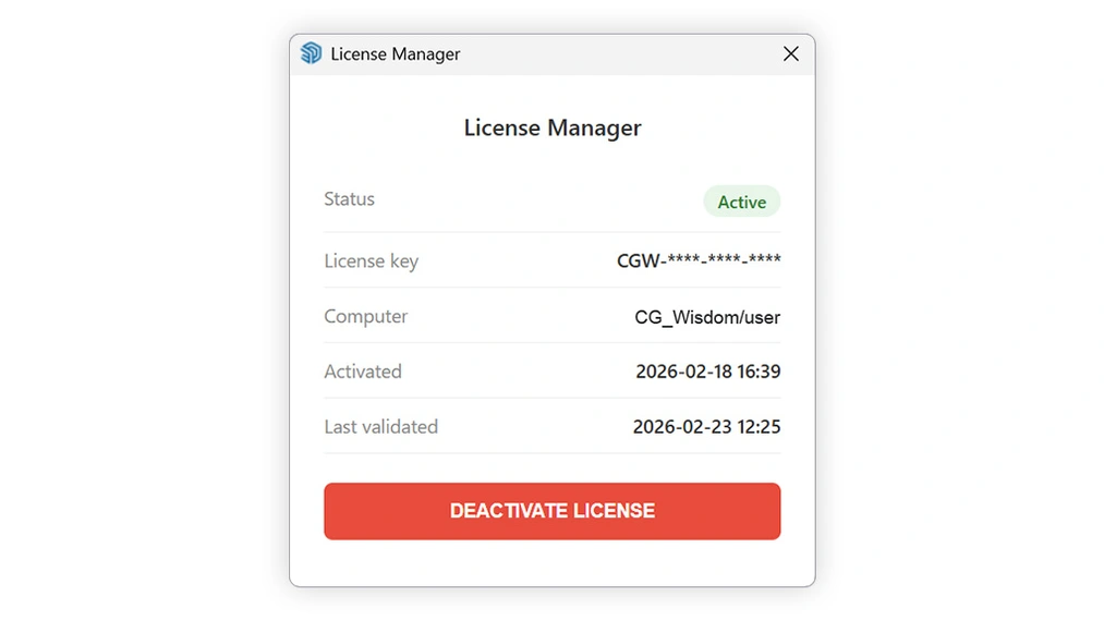 Después de completar el pedido, recibirás tu clave de activación única, que deberás pegar en la ventana del plugin. La licencia es válida para una estación de trabajo a la vez, pero hemos garantizado la máxima flexibilidad para tu trabajo.